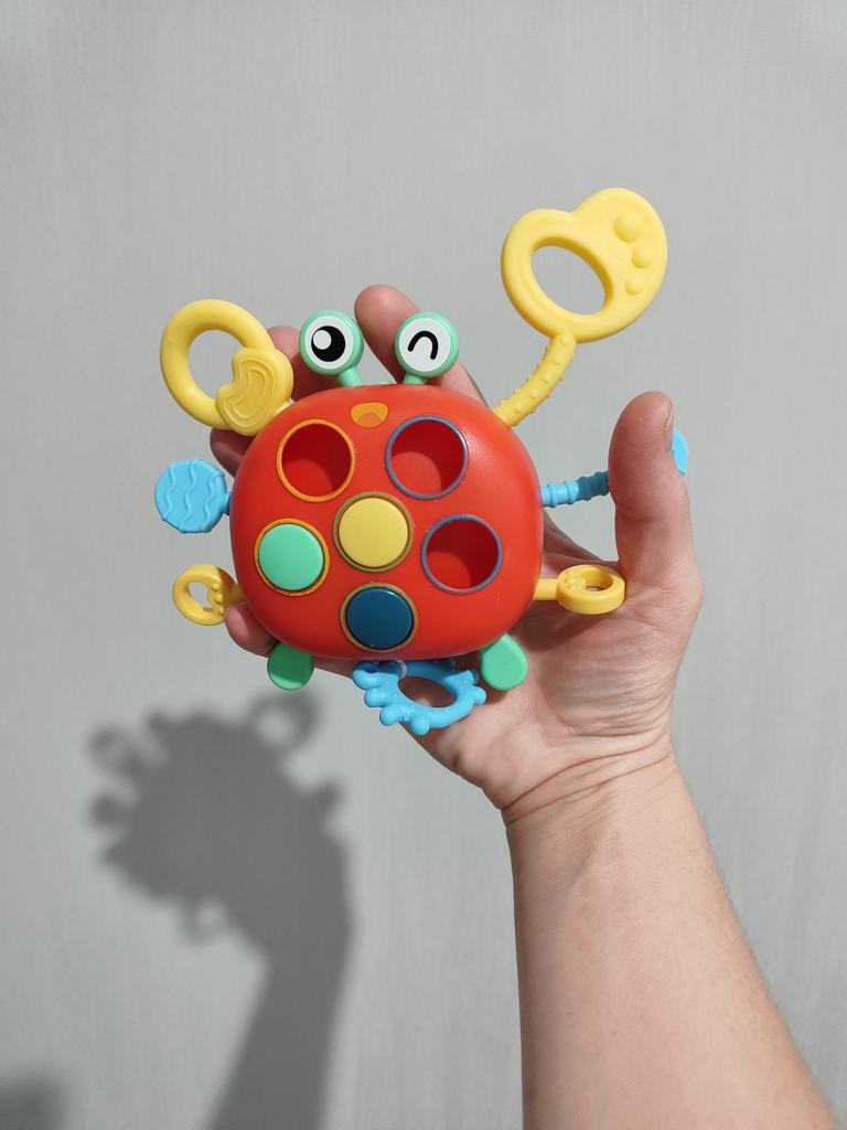 Ta zabawka edukacyjna w kształcie kraba wykorzystuje jaskrawe kolory, aby stymulować wzrok dziecka. Ma podobny efekt jak zabawka sensoryczna UFO, tj.. sensoryczna zabawka silikonowa poprawia motorykę palców u dziecka.
