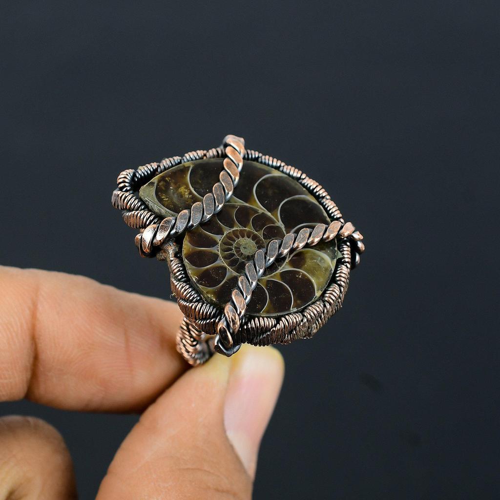 Skamieniałość Amonitu Kamień Szlachetny Owinięty Miedzianym Drutem Ręcznie Robiona Biżuteria Pierścionek Dla Niej