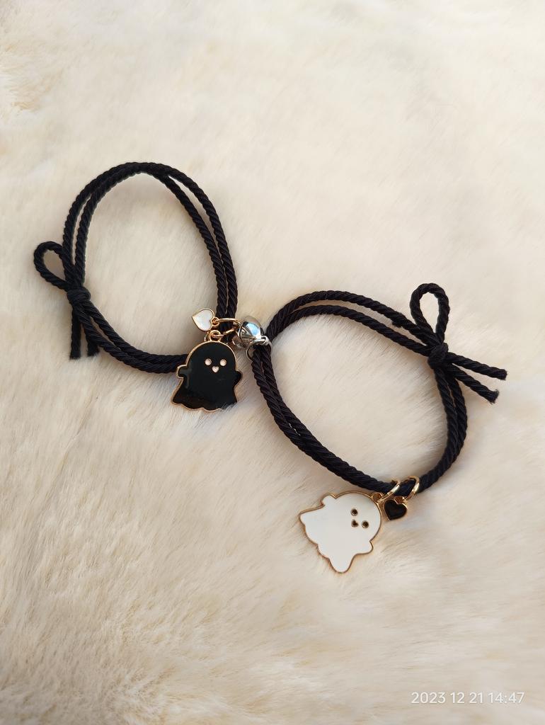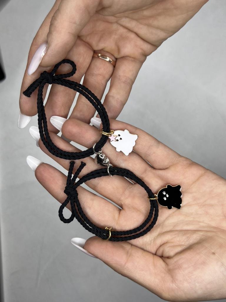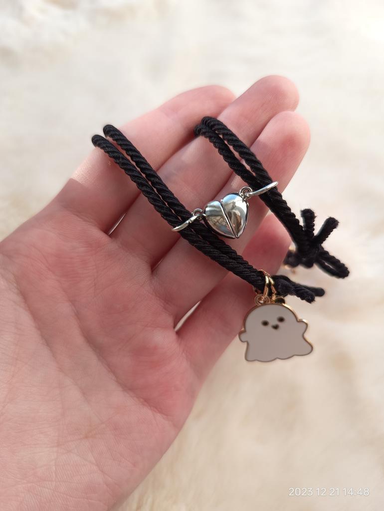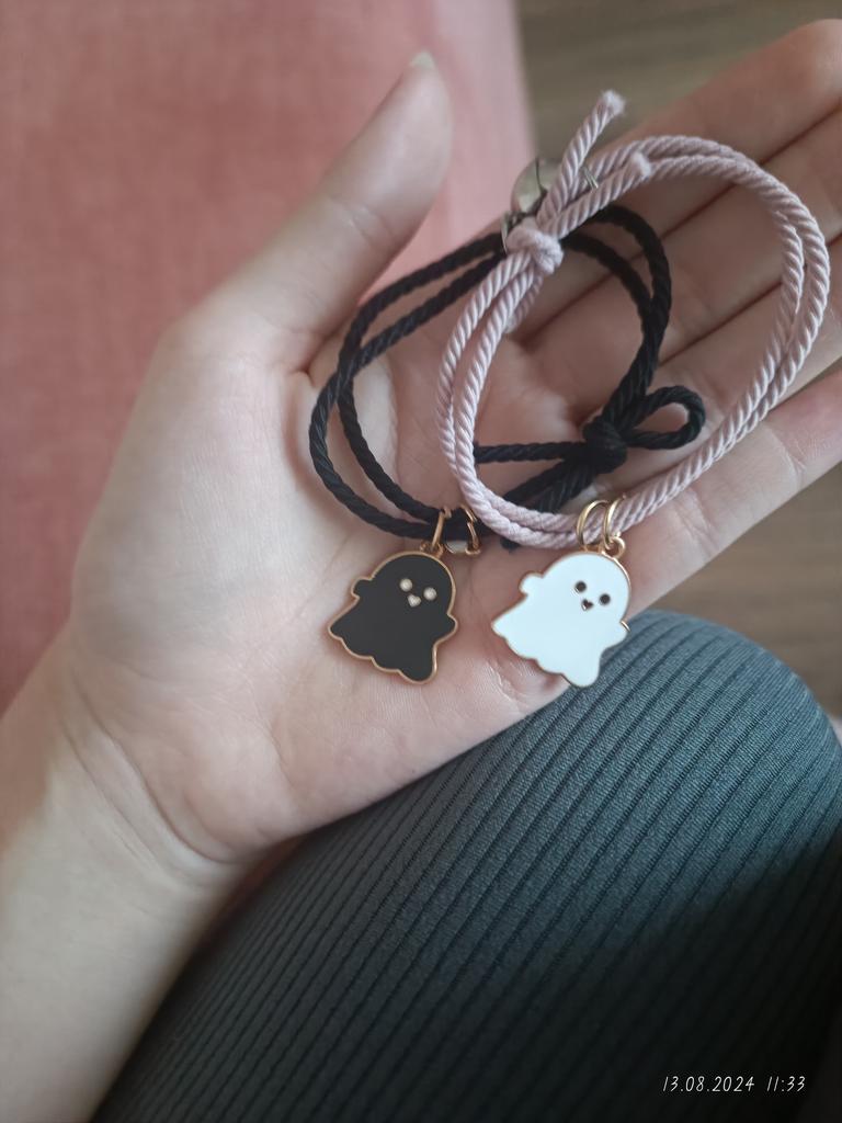 Miło mnie zaskoczyli🥰 Bransoletka jest typu sznurkowego, ale jest gumowa, dość gruba, bardzo ładnie wygląda z tą 🎀 kokardką, bardzo mi się podoba 🥰 Idealny dla każdego rozmiaru, ponieważ jest regulowany Na prezent 🎁bardzo ładne 😍 i oryginalne Ma detale takie jak serce ❤️ w różnych kolorach 🌈 gdzie 👻 czarny duch 🖤 serce odpowiada kolorowi wisiorka, a drugie jest białe 🤍 Jest wspaniale 💥 Tworzą serce ❤️ w środku 💔 zapałkę, która łączy się za pomocą magnesu 🧲 sklejanie bransoletek 💯 Wydaje mi się to mega oryginalne Dobra jakość 💯 w przystępnej 🤑 cenie Polecamy w 100% 💯