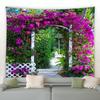 Widok na ogród gobelin ogrodzenie naturalna roślina kwiatowa gobelin ścienny wiszący salon pokój wieloosobowy estetyka dekoracja wnętrz