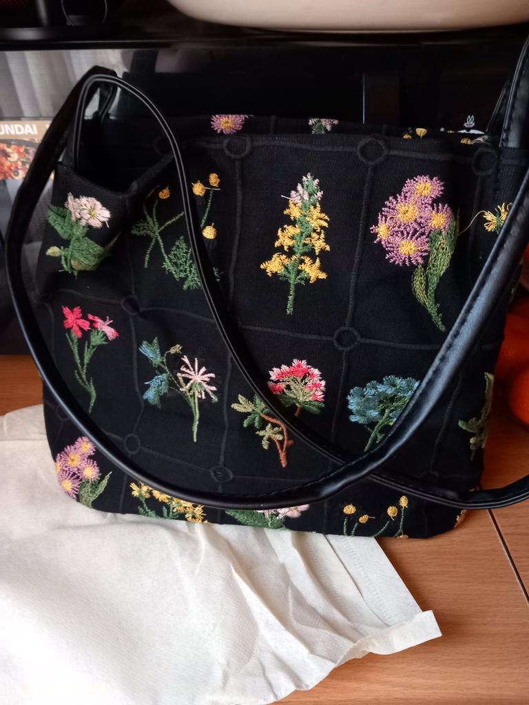 Dałam tylko 4 gwiazdki, ponieważ torba jest trochę mała i wykonana z grubej satyny, myślałam, że będzie z aksamitu. Spód i uchwyty są wykonane z czarnej skóry ekologicznej, jeden uchwyt jest dłuższy od drugiego. Jedna kieszeń wewnętrzna. Zapięcie na zatrzask. Podoba mi się haft: schludny i jasny, idealny na lato.