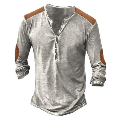 Męski T-shirt z długim rękawem i nadrukiem w kontrastowym kolorze w stylu retro, z dekoltem w kształcie litery V zapinanym na 7 guzików, przeznaczony do cienkiego T-shirtu męskiego z długimi rękawami.