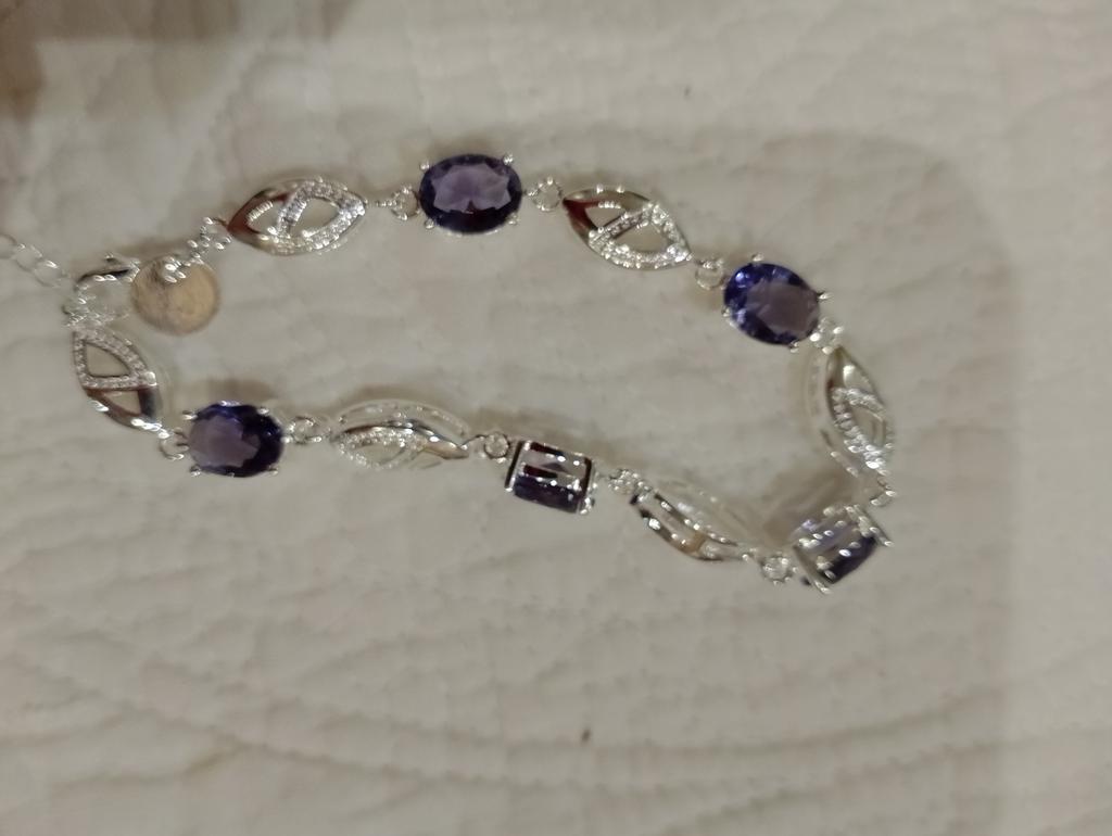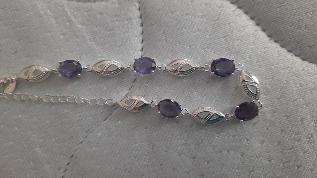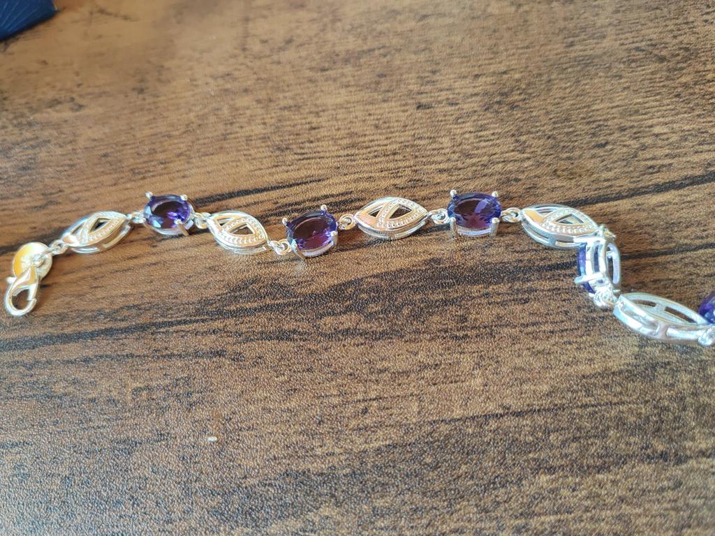 Delikatna srebrna bransoletka z małymi liliowymi kamyczkami..Praca staranna.Odcisk z próbą jest.