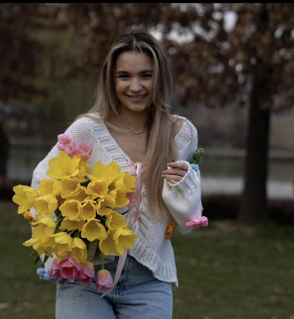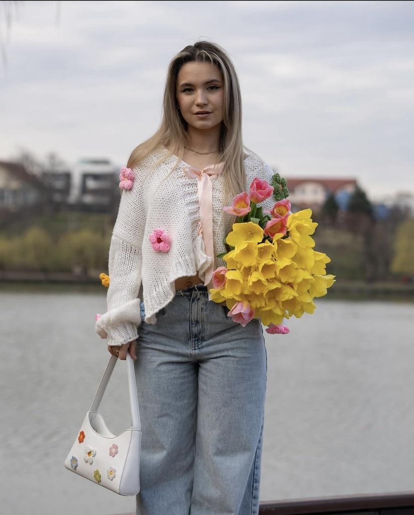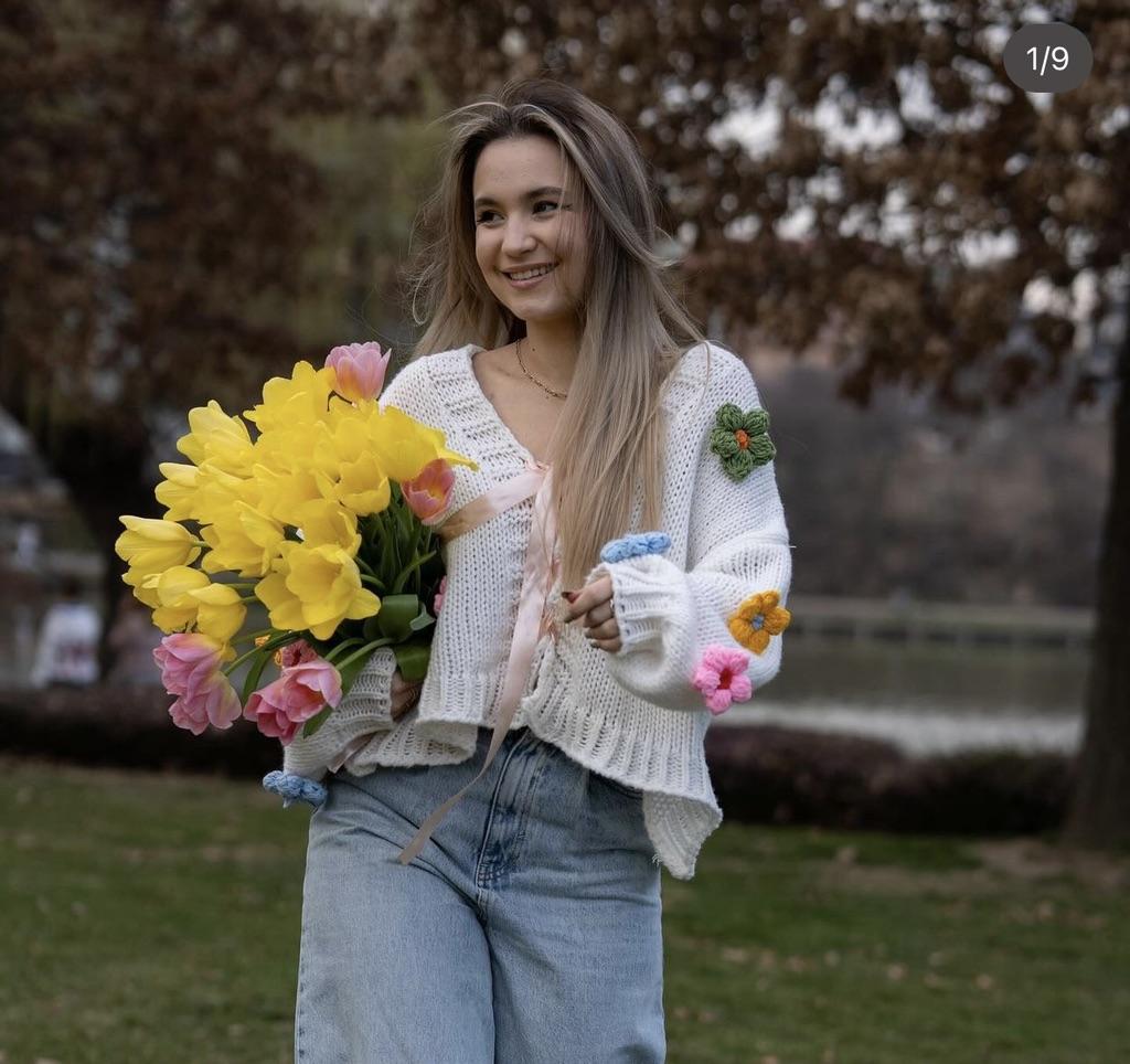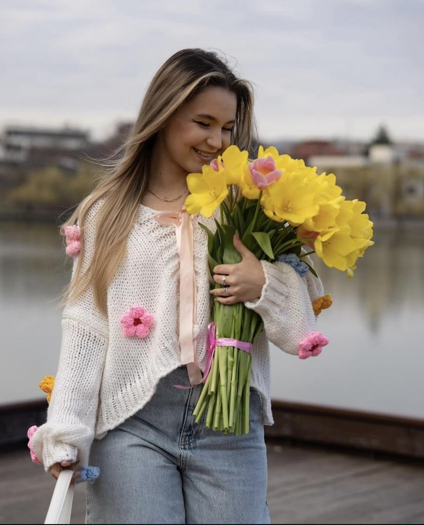 Dzianinowy kardigan 🧶 Wzięłam rozmiar M, noszę S, żeby pasować na szerszą. Myślę, że jest szyty ręcznie i jest bardzo dobrze wykonany 😊 Jest bardzo piękny. Od jakiegoś czasu szukałam takiego kardiganu z popcornem 3D. Nie ma guzików, jest rozpinana, ale przewiązałam ją tasiemką, żeby móc ją nosić jak bluzkę 🌸