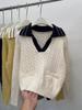 Damski, luźny sweter z dzianiny, z długimi rękawami i klapami w bloki kolorów