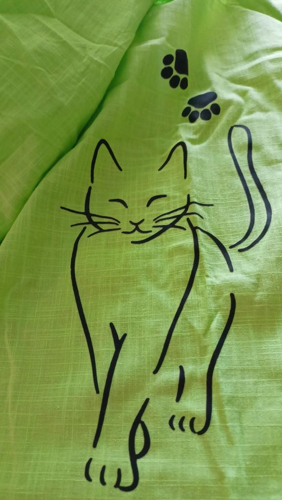 Tkanina jest przyjemna, rozmiar odpowiada. O zdjęciu kota (wklejonym) napiszę po umyciu...