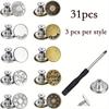 Bez szycia - odpinane przypinki na guziki: Produkt przyjmuje formę nasadki guzikowej i nitu gwintowanego. Wystarczy użyć małego śrubokręta z zestawu narzędzi i dokręcić gwintowany nit, bez szycia, stosowania ciężkich narzędzi naprawczych lub młotków, guzik będzie mocno przymocowany do ubrania i nigdy nie odpadnie. Sposób instalacji jest bardzo prosty, a ponieważ przyciski są wyjmowane, odłączane i wielokrotnego użytku - oszczędzaj pieniądze.