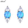 925 srebro okrągły biały niebieski ognisty opal kolczyki dla kobiet mała cyrkon Birthstone podwójne kolczyki damska biżuteria