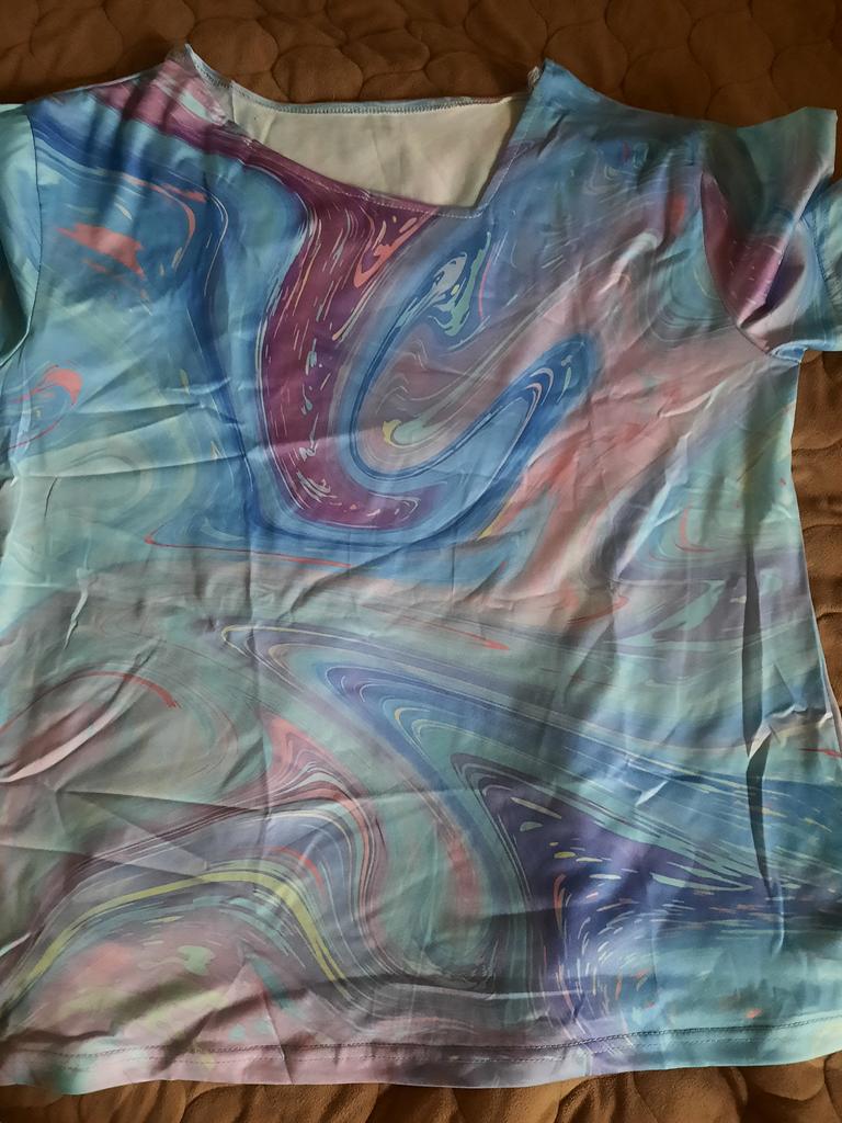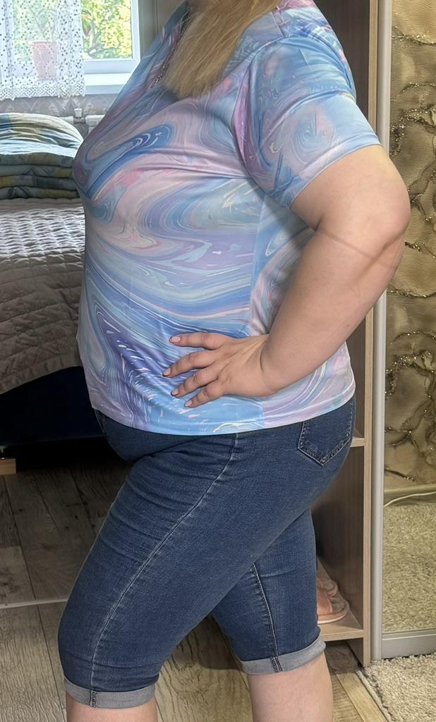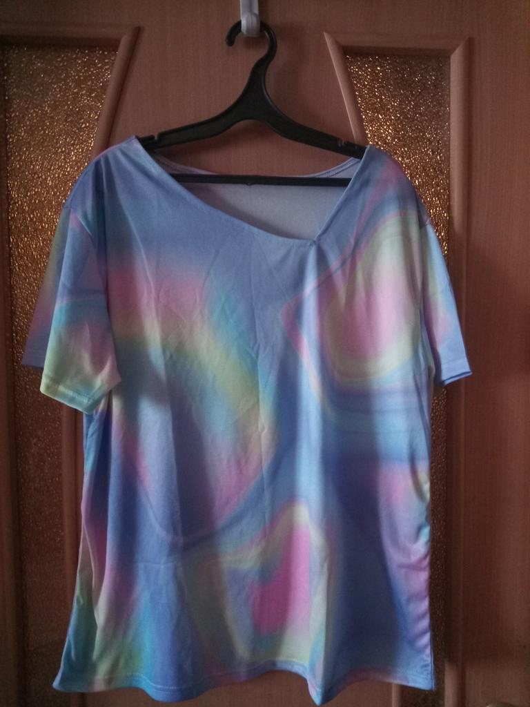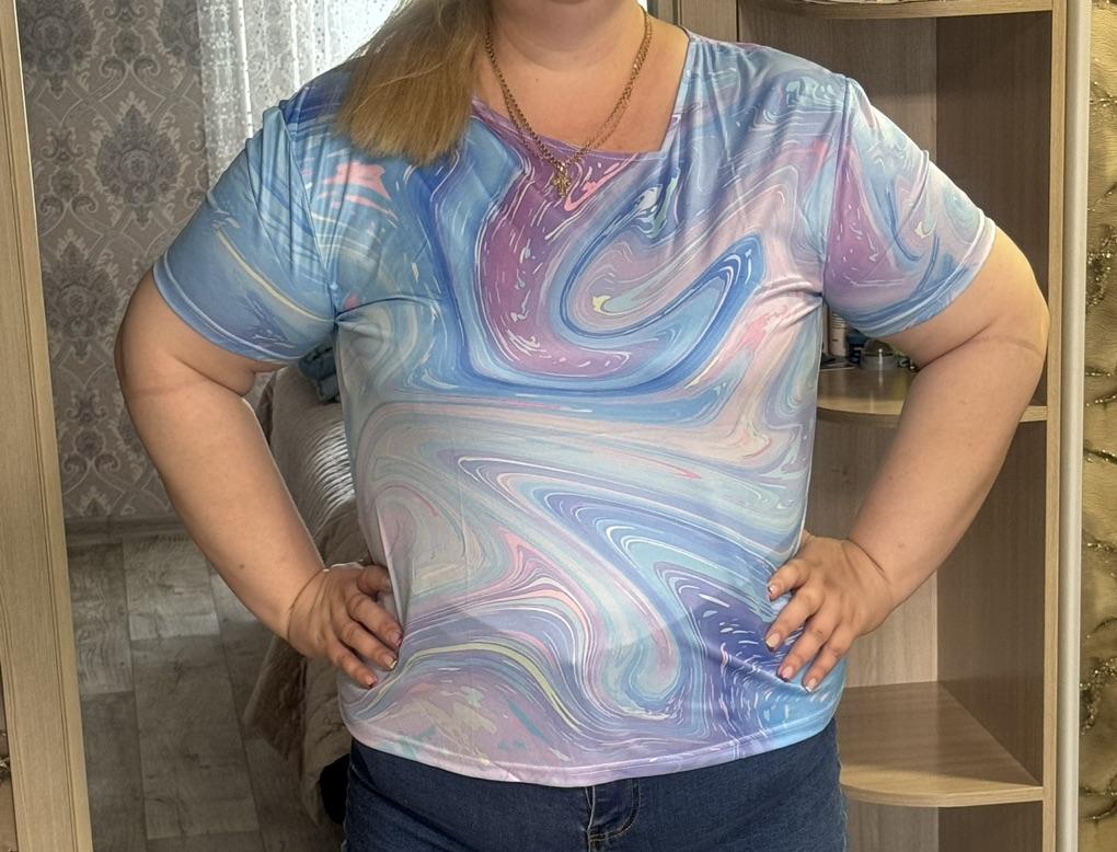Koszulka jest za duża nawet po praniu. Na zdjęciu koszulka jest jaśniejsza. Myślę, że ten produkt jest odpowiedni dla wysokich dziewczyn do rozmiaru 48.