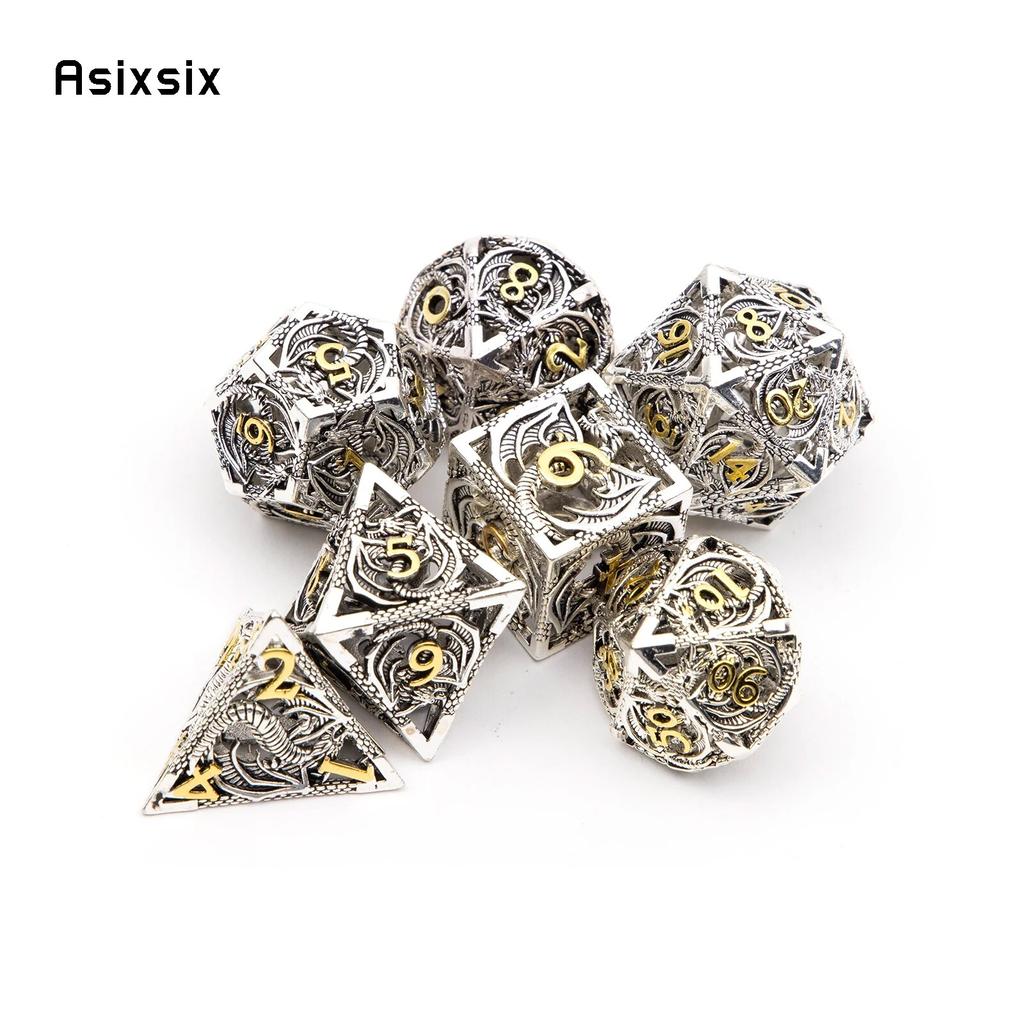 7 sztuk srebrnych złotych metalowych kostek smoka, pustych metalowych wielościennych kości, zestaw odpowiedni do gier RPG, gier karcianych, gier planszowych