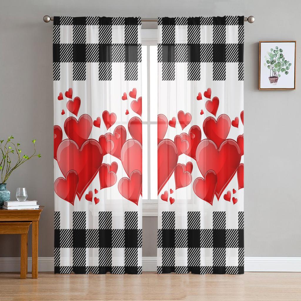 Czerwone serce miłości czarno-białe kratki tiulowe zasłony do salonu sypialni wystrój domu szyfonowa przezroczysta zasłona kuchenna