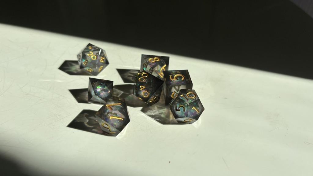 7 szt. czarnych płynących piaskowych złotych liczb ostrych krawędzi żywicy kostki wielościenne odpowiednie do gry RPG w planszówce