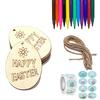 Wisiorek w kształcie jajka wielkanocnego zawiera drewniane ozdoby, liny konopne, pisaki akwarelowe i naklejki, co jest interesujące.
