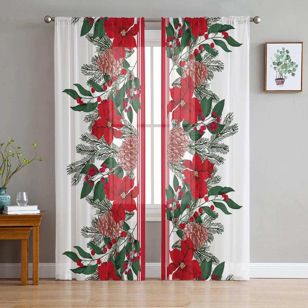 Bożonarodzeniowa Gwiazda Betlejemska Sosnowe Gałązki Przezroczyste Zasłony do Salonu Sypialni Tiulowa Zasłona do Kuchni Zasłona Woalowa Panele Roletowe