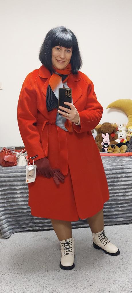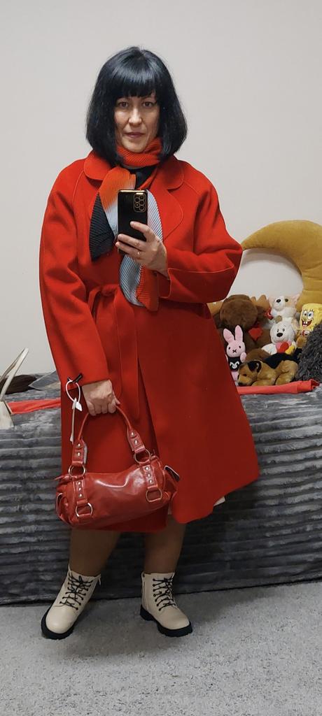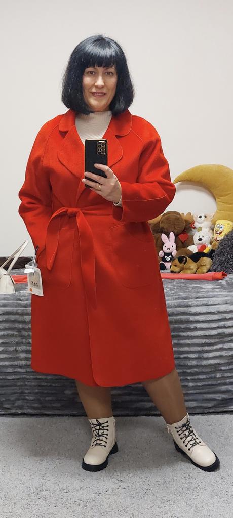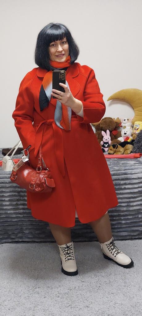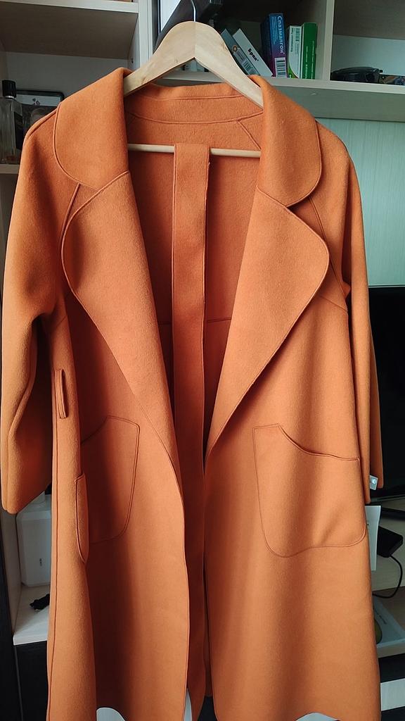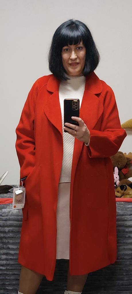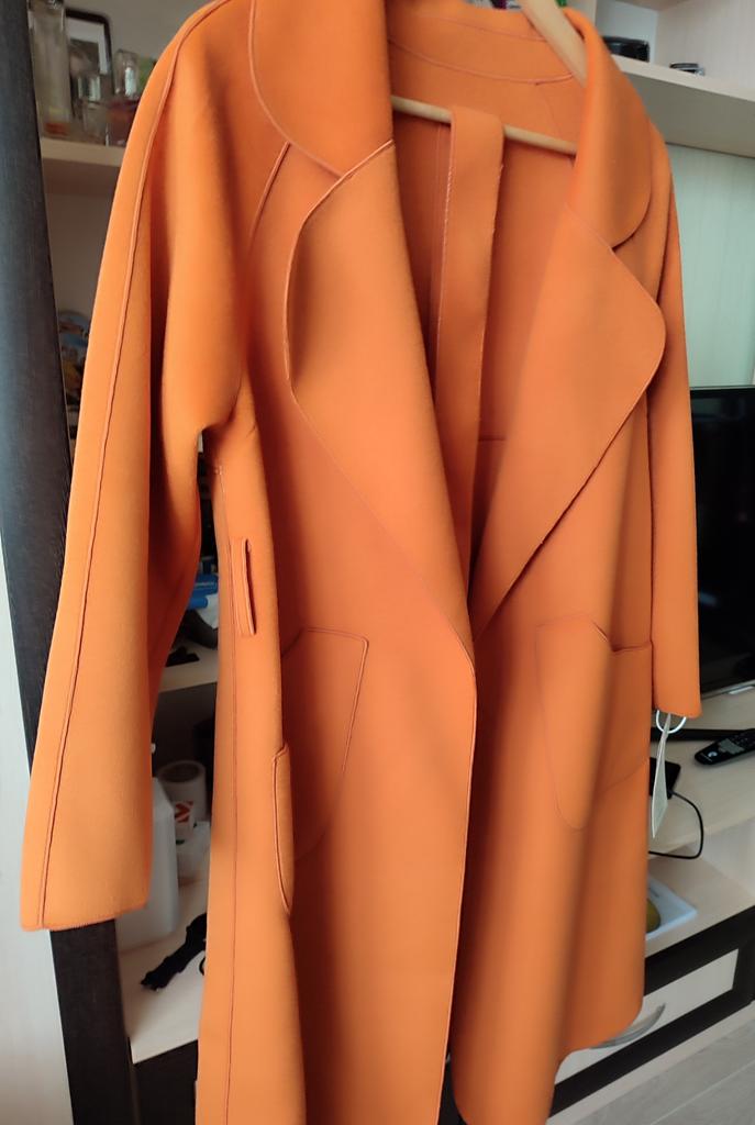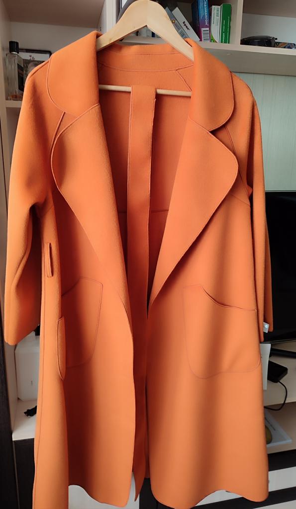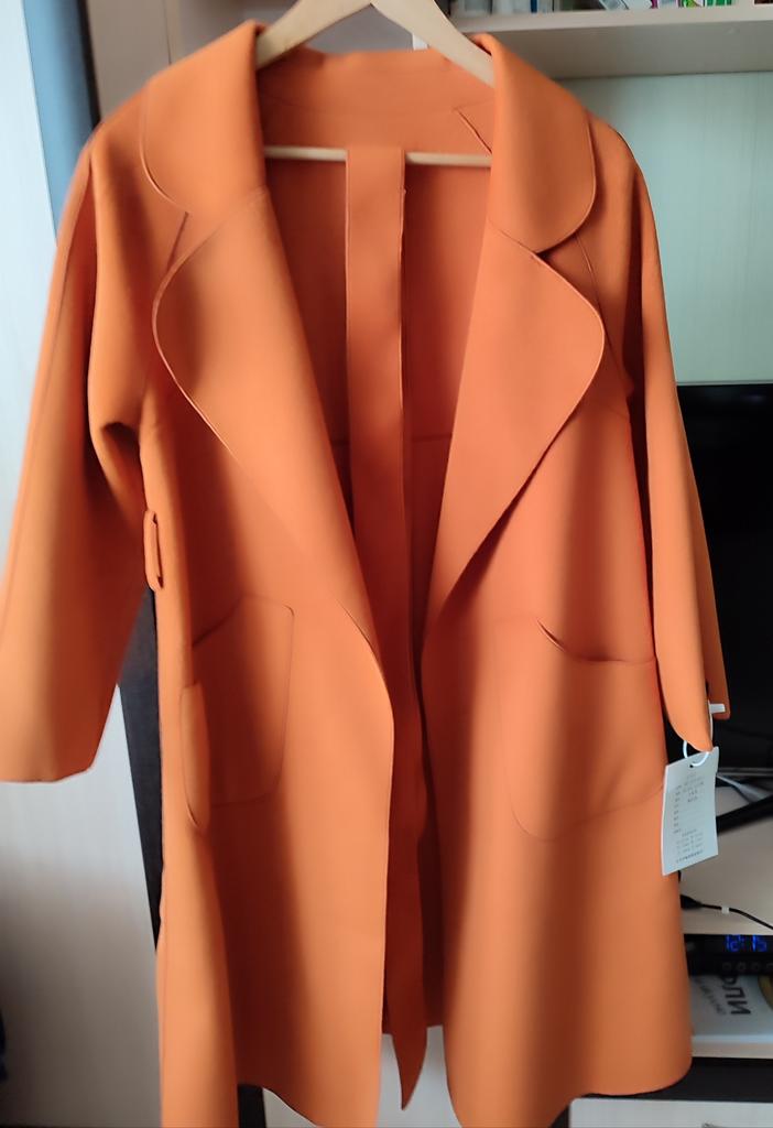 Ogólnie rzecz biorąc, nie jest źle, ale mnie to zdezorientowało.: 1. To nie jest właściwie płaszcz (ponieważ nie ma podszewki), ale peleryna.... Będzie stanowić pewną odmianę w Twojej garderobie. 2. Kolor - matowy pomarańczowy (jak na zdjęciu), w rzeczywistości bardziej zbliżony do ceglastego, dyniowego, czyli bardziej stonowany w odcieniach 3. Trudno nazwać ją ciepłą ze względu na brak podszewki, najlepiej nadaje się na ciepłe dni wiosenne od +15 stopni 4. Po owinięciu flara jest bardzo mała, sylwetka jest bardziej prosta (tak mi się wydawało)