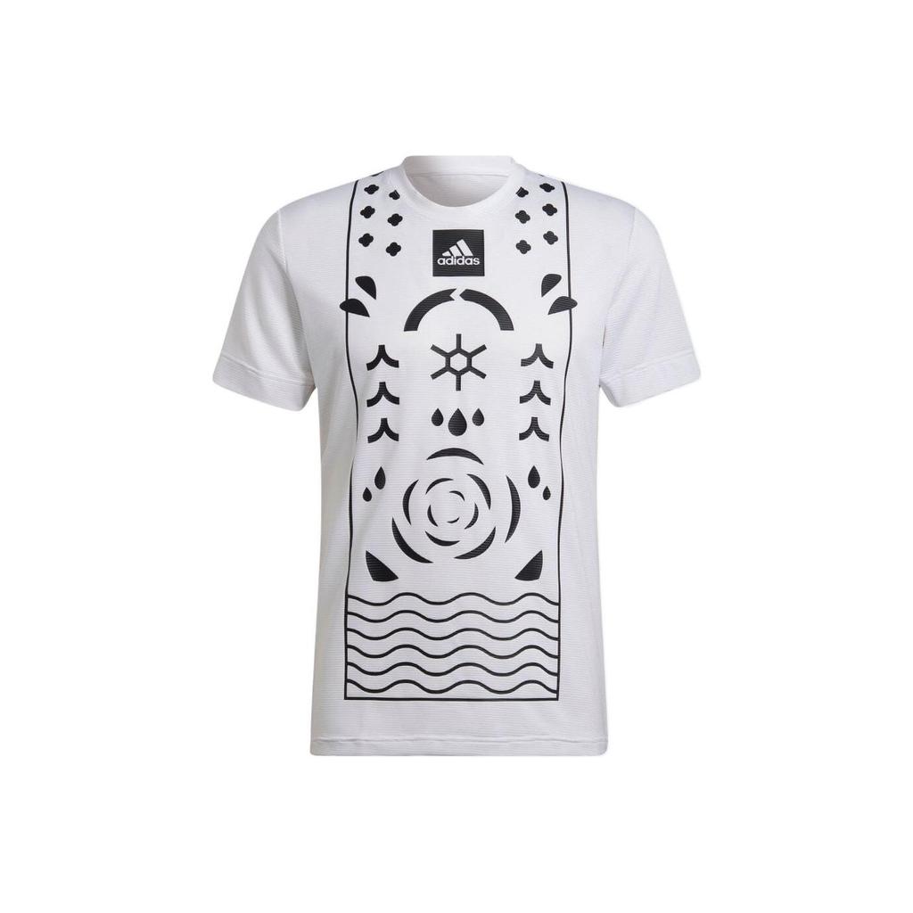 Adidas T-shirt męski z nadrukiem geometrycznym i logo, okrągłym dekoltem, biały HA2554