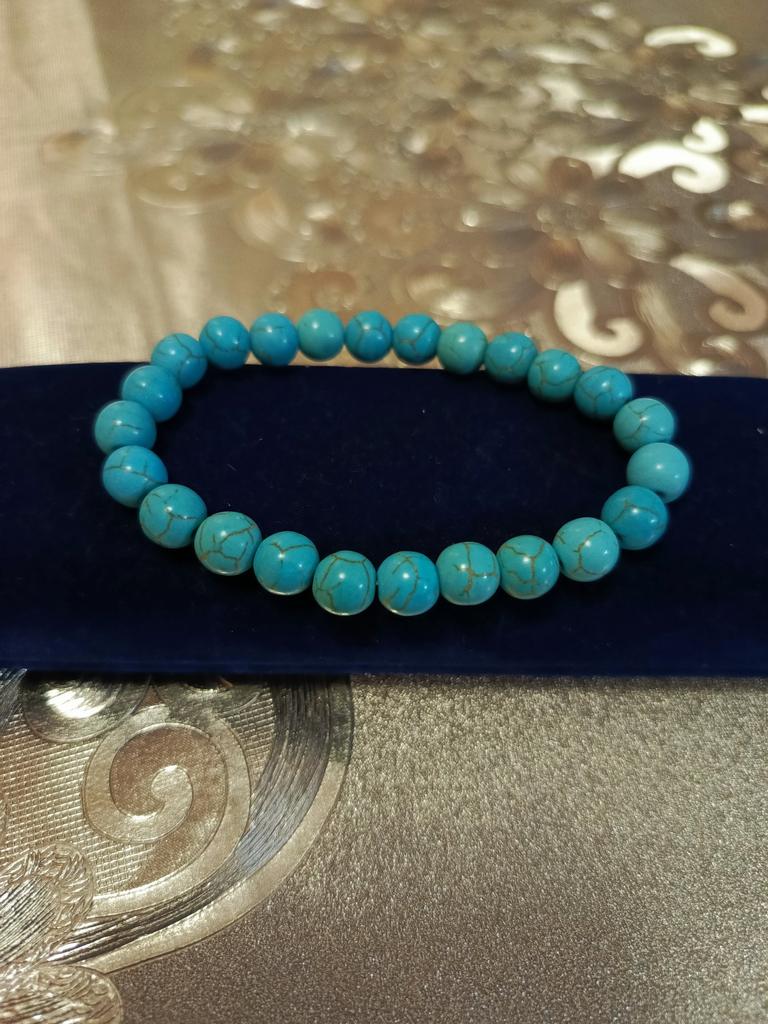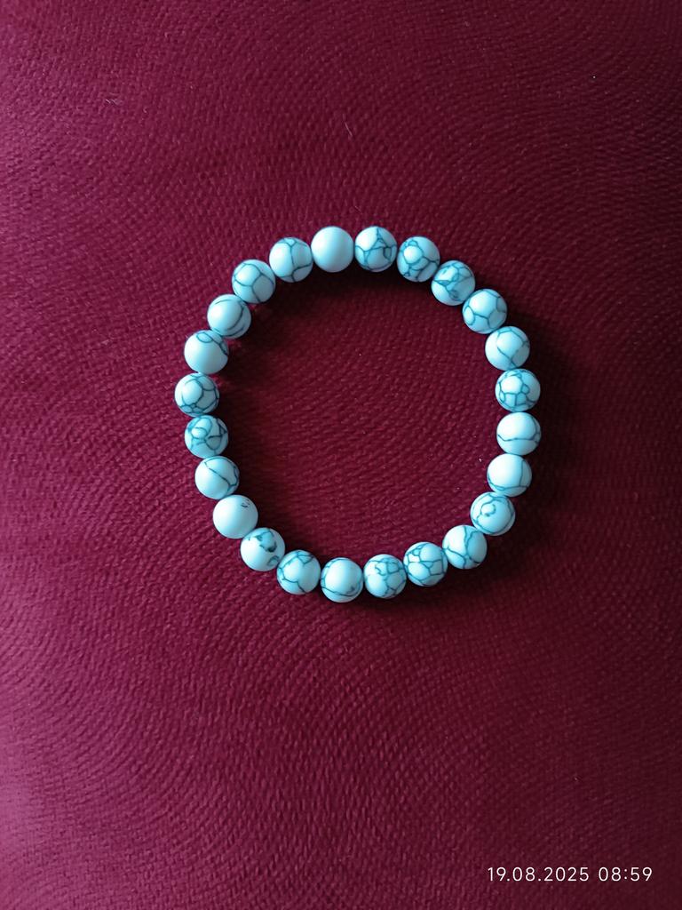 Bardzo ładna bransoletka z turkusem, jak na zdjęciu, kupiłam 12 bransoletek z perłami i ogólnie jestem zadowolona, z wyjątkiem bransoletki z różową perłą, która jest znacznie ciemniejsza niż na zdjęciu i bransoletki z kamienia Amazonki we wszystkich kolorach, z pomarańczem i żółte koraliki, wysłano mi całą niebieską bransoletkę.