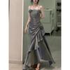 Koreańska Vintage aksamitna długa sukienka damska luksusowa szczupła syrenka Spaghetti pasek sukienka kwiatowa elegancka seksowna swobodna suknia wieczorowa
