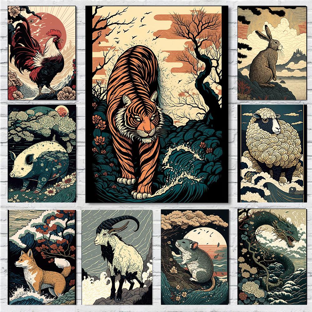 Asian Animals Zodiac Signs Japan China Prints Poster Canvas Painting Modern Wall Art Pictures for Living Room Bedroom Home Decor