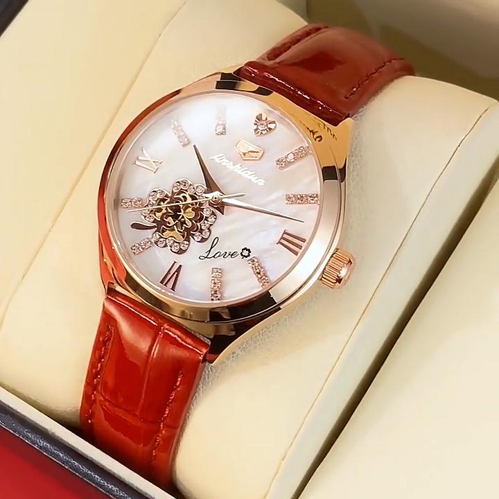 Marka JINSHIDUN Modny Zegarek Mechaniczny z Wydrążonym Wzorem, Inkrustowany Diamentami, Czterolistna Koniczyna, Wodoodporny Zegarek Damski