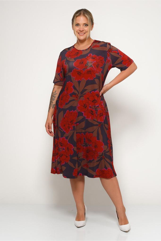 Produkt jest ponadgabarytowy. Sukienka o długości midi z okrągłym dekoltem i krótkimi rękawami., Zapewnia zarówno wygodę, jak i stylowy wygląd., Materiał produktu jest lejący, nie przylega do linii ciała., 95% Wiskoza, 5% Elastan., Wzór Produkt jest cyfrowy. Odwróć produkt na lewą stronę w temperaturze 30 stopni. Umyj go. Rozmiar na manekinie to rozmiar 50. Wymiary modelu Wysokość: 1,75 Skrzynia: 98 Czeka: 84 Biodra: 116 cm..