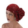 Elastyczna, koralikowa, damska czapka turban z dużym kwiatem
