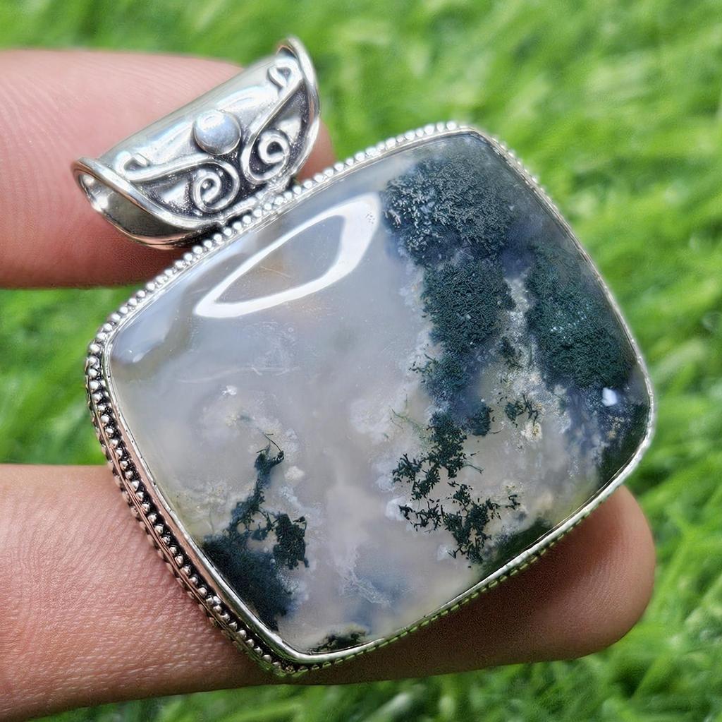 Naturalny wisiorek z mchu agatowego, wisiorek ze srebra próby 925, kwadratowy wisiorek ze srebra z mchu agatu, prezent dla niej