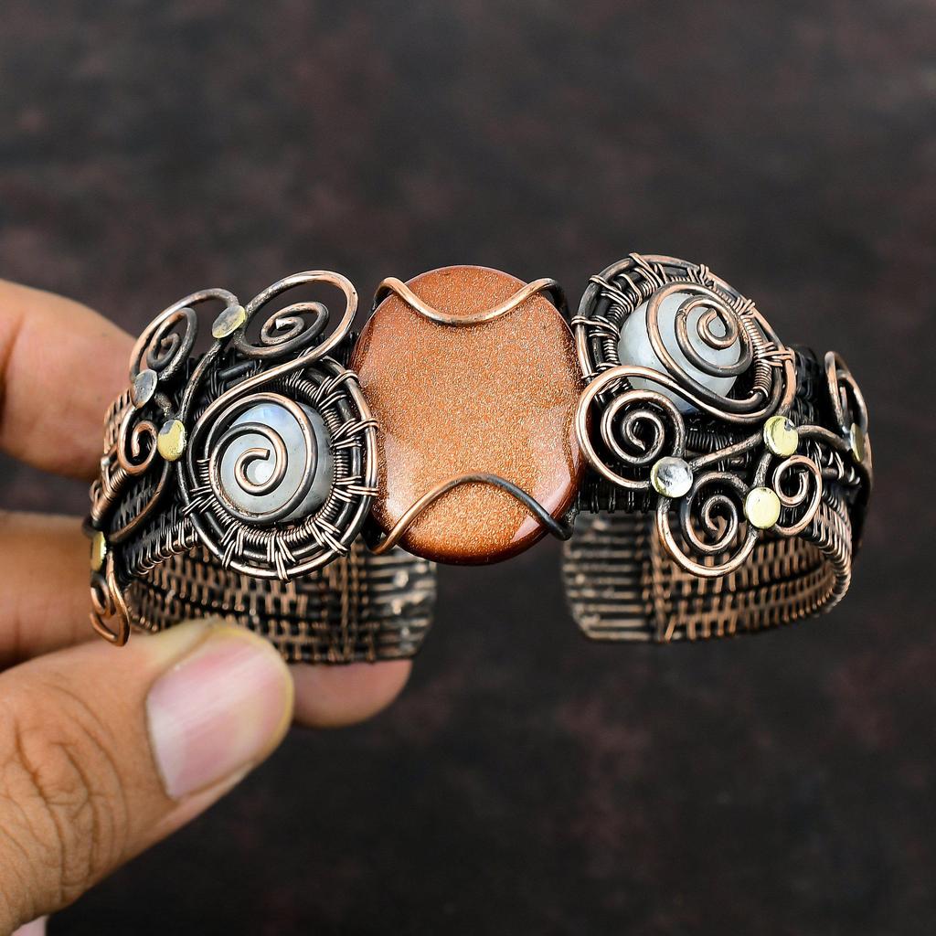 Bransoletka Sun Sitara z mankietem, tęczowy kamień księżycowy, bransoletka z kamieni szlachetnych, miedziany drut, regulowana bransoletka z mankietem, prezent dla niej, ręcznie robiona biżuteria z miedzi