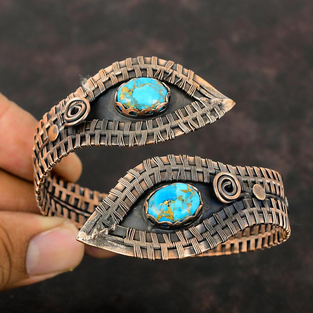 Miedziana Bransoletka Turkusowa Miedziana Bransoletka Miedziana Opleciona Kamieniem Szlachetnym Miedziana Biżuteria Ręcznie Robiona Bransoletka Mankieta Prezent Dla Niego