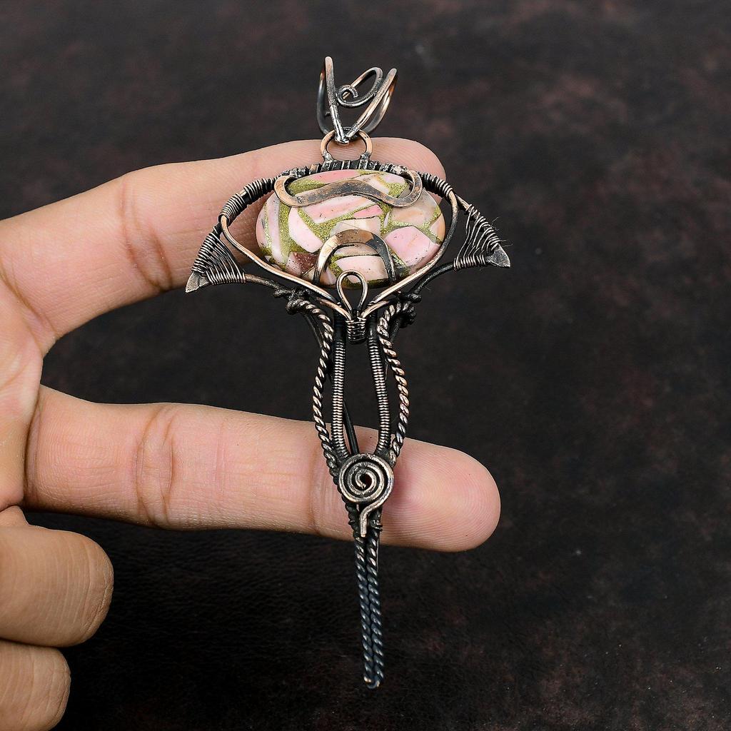 Miedziany wisiorek z różowym opalem, owinięty miedzianym drutem, biżuteria z różowym opalem, wisiorek z kamieniem szlachetnym dla kobiet, ręcznie robiona biżuteria z miedzianego drutu, prezent dla niego