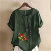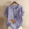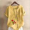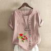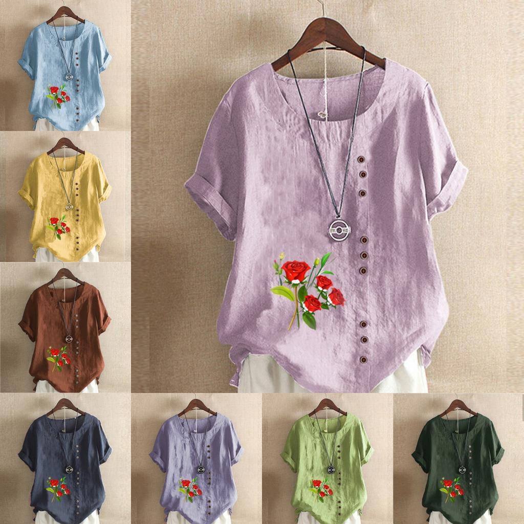 Damska moda kwiaty nadruk okrągły dekolt krótki rękaw T-shirt swobodna bawełna len grafika koszula wypoczynek luźna letnia bluzka topy plus size