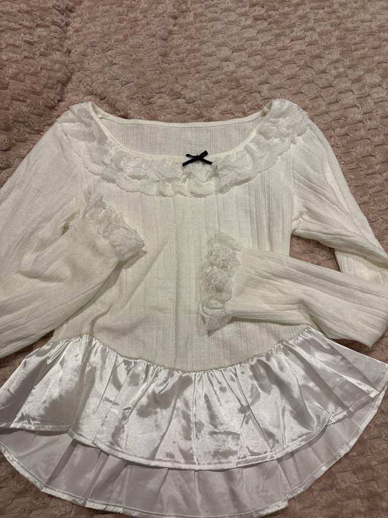 Deeptown Coquette Koreański styl Białe koszulki damskie Fairycore Słodkie falbany Długie rękawy Koszulki Y2k Słodkie smukłe gorsetowe topy Jesień