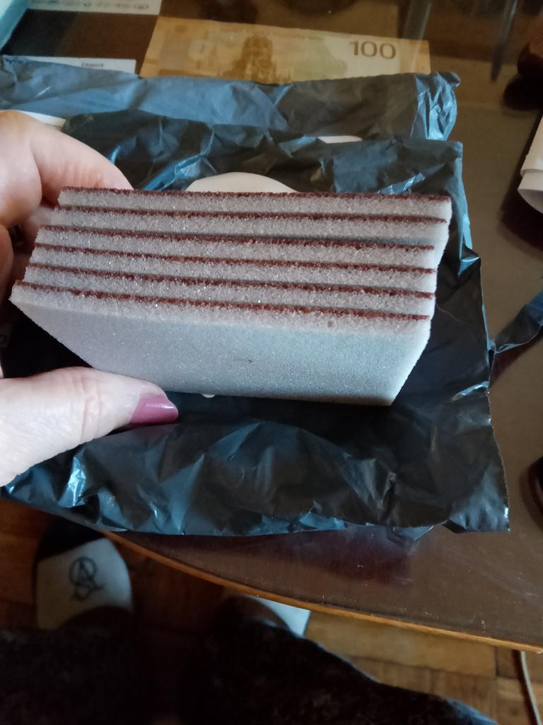 Produkt zgodny z opisem, dziękujemy sprzedawcy 👍 Gąbka z jednej strony jak guma piankowa, z drugiej strony jak papier ścierny.