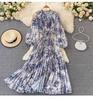 American Chic Maxi Sukienki dla Kobiet Drukowane O-neck Latarnia Rękawy Kobiece Vestidos De Mujer Sukienka A-line Lace-up