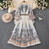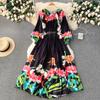 Jesienna Plisowana Wspaniały Kwiatowy Nadruk Wakacyjna Sukienka Maxi Kobiety Okrągły Dekolt Rękaw Lampion Wysoki Elastyczny Pasek Długie Ubranie