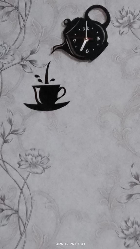 Zegar ścienny Czajniczek i filiżanka. Czajnik mocowany jest na haku. Kubek i krople są samoprzylepne. Produkt dotarł w pudełku, dobrze zapakowany. Wskazówki są oddzielne, można je łatwo przymocować do zegarka. Zegar zasilany jest baterią (brak w zestawie) Sprzedawca ma go w trzech kolorach. Niezwykły i piękny dodatek do kuchni.