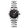 Stainless steel case with a stainless steel bracelet. Fixed stainless steel bezel. Black dial with silver-tone dauphine-style hands and Roman numeral hour markers. Minute markers around the outer rim. Dial Type: Analog. Date display at the 3 o'clock position. ETA caliber 2671 automatic movement, containing 25 Jewels, bitting at 28800 vph, and has a power reserve of approximately 38 hours. Scratch resistant sapphire crystal. Pull / push crown. Transparent case back. Round case shape. Case size: 25 mm. Case thickness: 9.14 mm. Band width: 13 mm. Fold over clasp with a push button release. Water resistant at 30 meters / 100 feet. Functions: date, hour, minute, second. Baroncelli IIi Series. Dress watch style. Watch label: Swiss Made. Mido Baroncelli III Automatic Black Dial Ladies Watch M010.007.11.053.09.