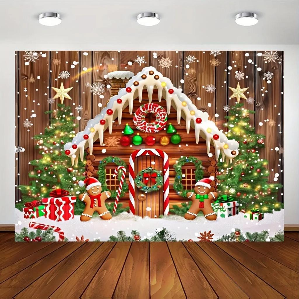 Tło dekoracji świątecznej z piernika w kształcie domku na drzewku bożonarodzeniowym, gobelin ścienny odpowiedni do użytku na zewnątrz domu