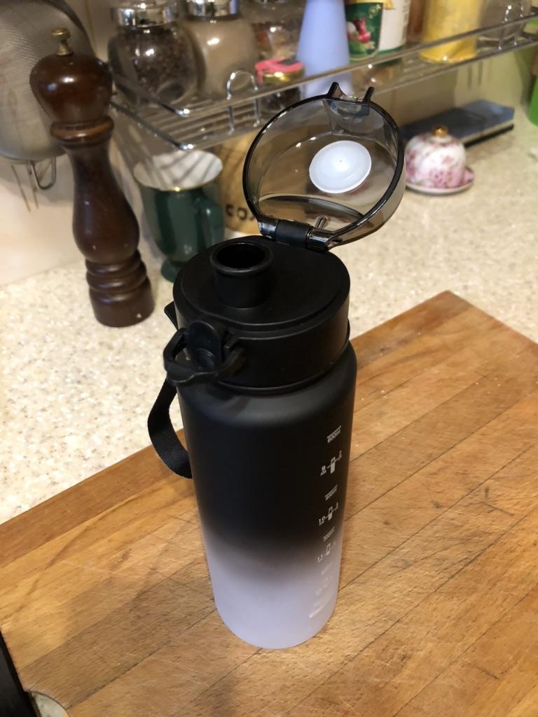 Butelka jest super, ma blokadę pokrywki, otwiera się przez naciśnięcie przycisku