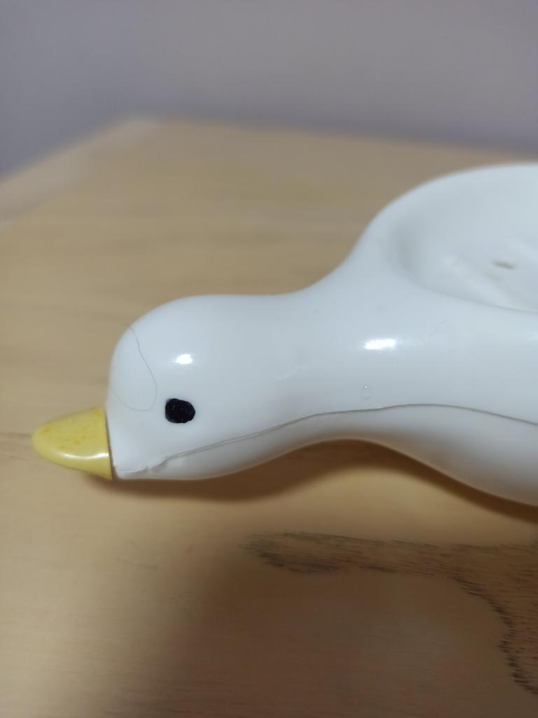 kaczka na mydło trochę za mało wygięta szyja w dół i woda nie chce spływać, dopiero jak ją przekrzywię mocno, ale wtedy mydło będzie zjeżdżać - na filmiku test, a poza tym jest nieszczelna na boku głowy i leje się bokiem, choć żeby leciała woda dziubkiem tak jak powinna, to dziurka odpływowa powinna być niżej, zawsze można rozgrzać igłę i zrobić dziurkę we właściwym miejscu, pod spodem dziubka, wtedy woda powinna spływać.