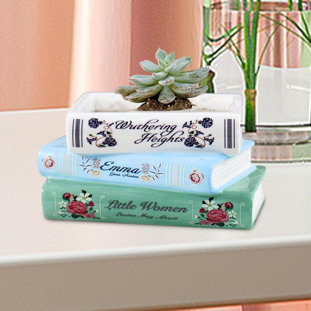 - 【Doniczka w kształcie książki】: Ta ceramiczna doniczka została zaprojektowana tak, aby wyglądać jak stos książek w twardej oprawie, z żebrowanymi detalami z jednej strony imitującymi ułożone strony.. Konstrukcja posiada również otwór z korkiem, dzięki czemu nadaje się do roślin doniczkowych.