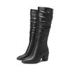 Krazing Pot Buty Jesienno-Zimowe ze Skóry Krowiej Grube Wysokie Obcasy Duży Rozmiar 45 Rozmiar 44 Szpiczasty Nosek Plisowana Dekoracja Kobiety Utrzymują Ciepło Kozaki do Połowy Łydki