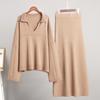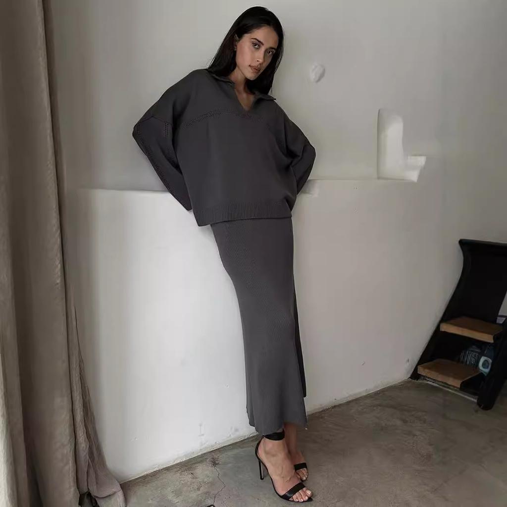 Ten stylowy dwuczęściowy zestaw swetrów zawiera sweter zakładany przez głowę z okrągłym dekoltem i ołówkową spódnicę z wysokim stanem. Modna długość za kolano i jednolity kolor.