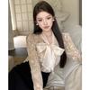 Modna koszula casual z długim rękawem z kołnierzykiem z muszką, damska, elegancka, gładka, prosta, bluzki i topy damskie, vintage, slim fit, biała bluzka, odzież damska 25852