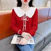 Sweter dzianinowy z dekoltem typu "varsity" i kokardką, z długim rękawem, modny element odzieży wierzchniej na jesień i zimę, z wiązaniem, emanujący temperamentem i stylem