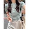 Right shoulder, round neck, short-sleeved T-shirt for women, spring and summer, petite temperament, versatile, slimming, slimming bottoming outer top