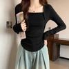 Damski obcisły T-shirt z długim rękawem, plisowany, z kwadratowym dekoltem, imitujący dwuczęściowy, seksowny, podkreślający obojczyki, idealny na wczesną jesień.