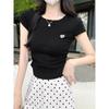 Bordowy T-shirt damski z haftem na ramionach, krótki, odsłaniający pępek, prześwitujący, plisowany, dopasowany, niszowy, letni, z okrągłym dekoltem i krótkim rękawem
