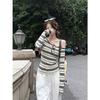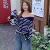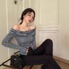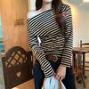 Contrast Striped Long-sleeved T-shirt for Women In Autumn New Temperament Versatile Sloping Shoulder Student Slim Slimming Top Trendy