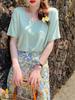 Modalna bawełniana koszulka z krótkim rękawem i maską dla kobiet Nowa koszulka z dekoltem w serek Top z lodowego jedwabiu Letnia zielona z krótkim rękawem